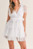 This Swiss Dot Mesh Tulle Mini Dress flaunts timeless style with its chic v-neck tiers and smocked waistband. Crafted from lightweight mesh tulle, it features Swiss Dot detailing and adjustable self tie straps for a custom fit. Perfect for special occasions.