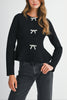 Elevate your everyday style with this elegant knit sweater top featuring sparkling jewel bow details down the front. Designed with a flattering peplum silhouette and long sleeves, this top blends sophistication with a playful twist. Though the bows are non-functional, a discreet snap button at the neckline allows for easy wear and a polished finish.